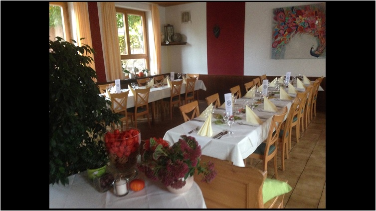 Bei einem Restaurant oder Gasthaus wird ein Tisch mit Essen vorausbestellt. Das Bild zeigt eine Räumlichkeit in einem Gasthaus (dort hat meine Familie schon öfters Feste gefeiert).